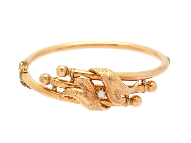 BANGLE, 18K gold, half pearl, 19th century´s second half, antique, safety chain, 57x51 mm, weight 11,7 g.