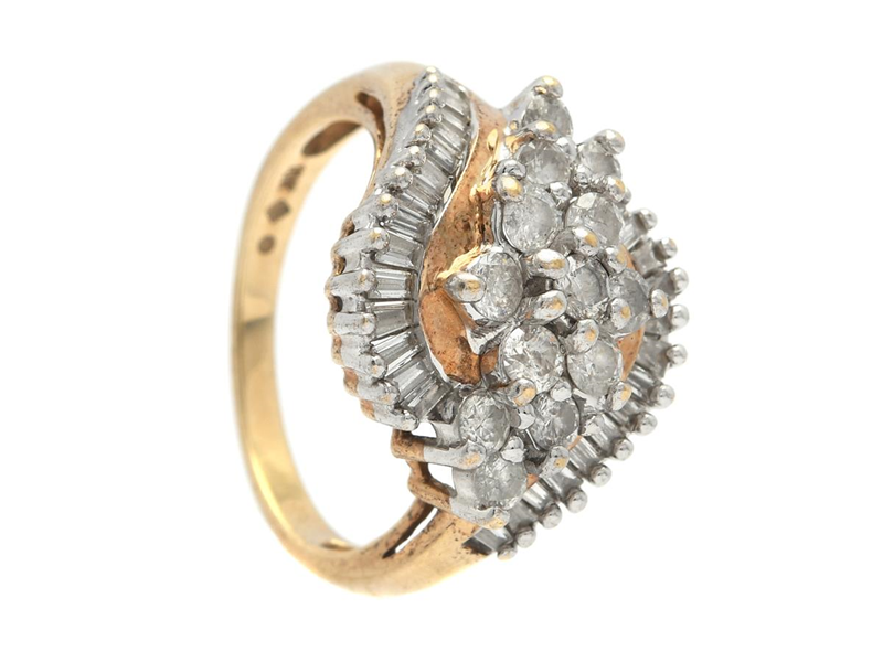 RING, 10K gold, 13 brilliant- and 28 baguette cut diamonds approx. 1,20 ctw, approx. Cr/P, size 17,5 mm, weight 5,5 g.