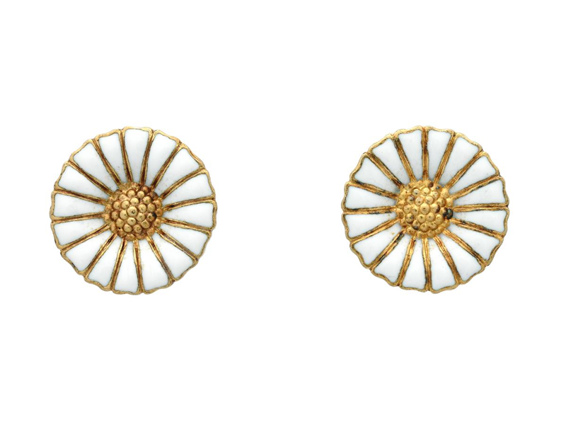 GEORG JENSEN, earrings, Daisy, gilted sterling silver, white enamel, diameter 11,5 mm, weight 2,9 g, pushback.