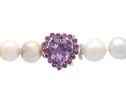 ATELIER AJOUR, pearl necklace, cultured salt water pearls approx. 10,5-11,0 mm, clasp in 18K white gold with a heartshape amethyst approx. 6,00 ct and rubies approx. 1,00 ctw, Stockholm, length 40 cm, weight 63,7 g, some pearls have surface defects, some rubies have notches and signs of wear.