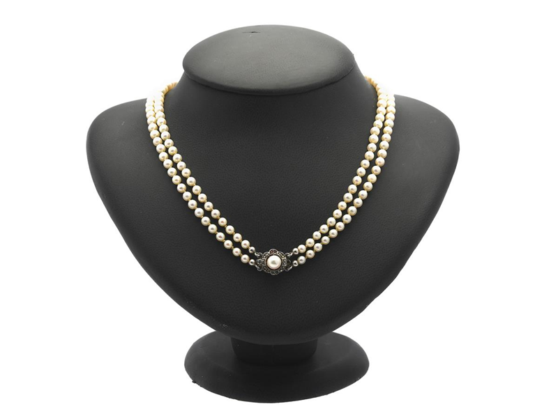 PEARL NECKLACE, 2-radigt, cultured pearls 3,5-7,5 mm, graduated, clasp i silver with marcasites, length 45 cm, knot, weight 27,9 g.