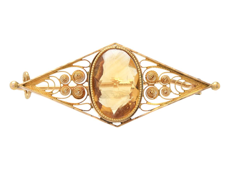BROOCH, 18K gold, oval-cut citrine, filigree work, width 39 mm, weight 2,8 g.