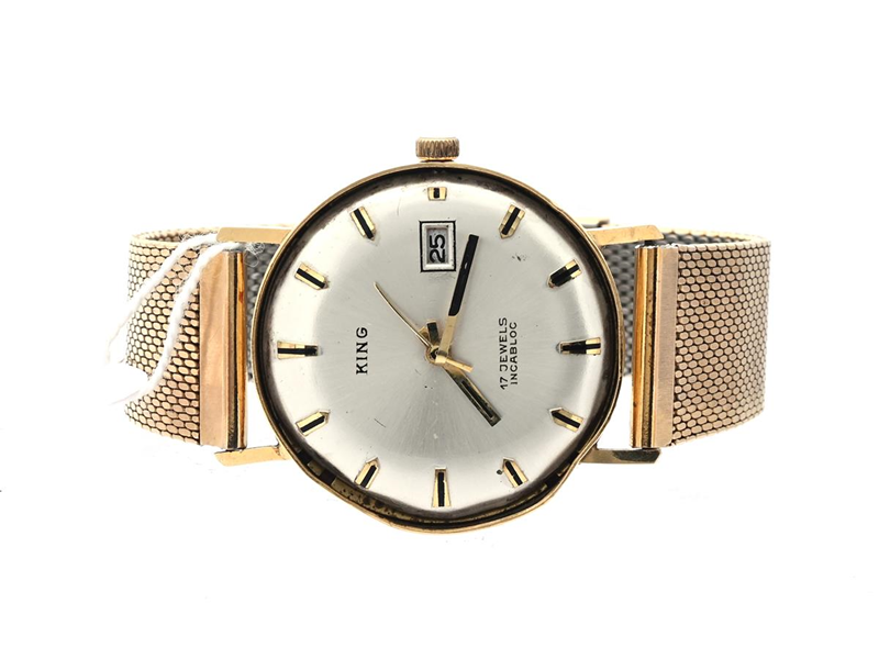 King, wristwatch, 18K, 34mm, date, missing glass, dented, defect movement, steel link, brv 51,0g