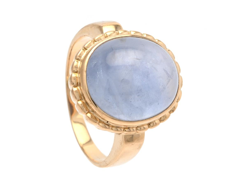 RING, 18K gold, cabochon cut light sapphire approx. 13x10,7x8 mm, size 17,25 mm, weight 8,1 g, case.