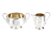 BOWL & POT, sterling silver, inside gilt, angel with dog, Clement, Denmark 1912, besiktingsmästare S. Groth, height 10-11,5 cm, total weight 387,1 g, dents.