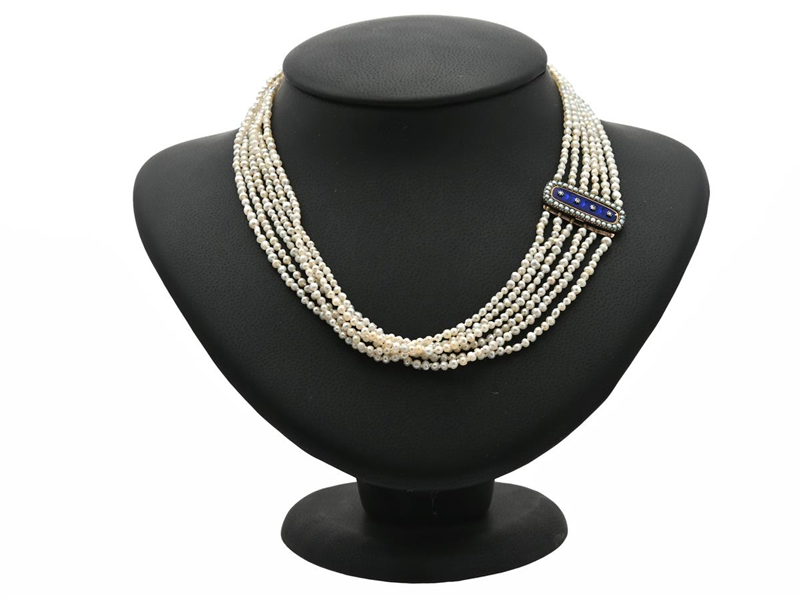 PEARL NECKLACE, 6 rows, various oriental and cultured sead pearl approx. 2,0-3,0 mm, clasp in 12K gold with blue enamel, half pearls and rose cut diamonds, antique, length 39 cm, weight 20,6 g, some pearls are worn, damage to the enamel and one half pearl is damaged.