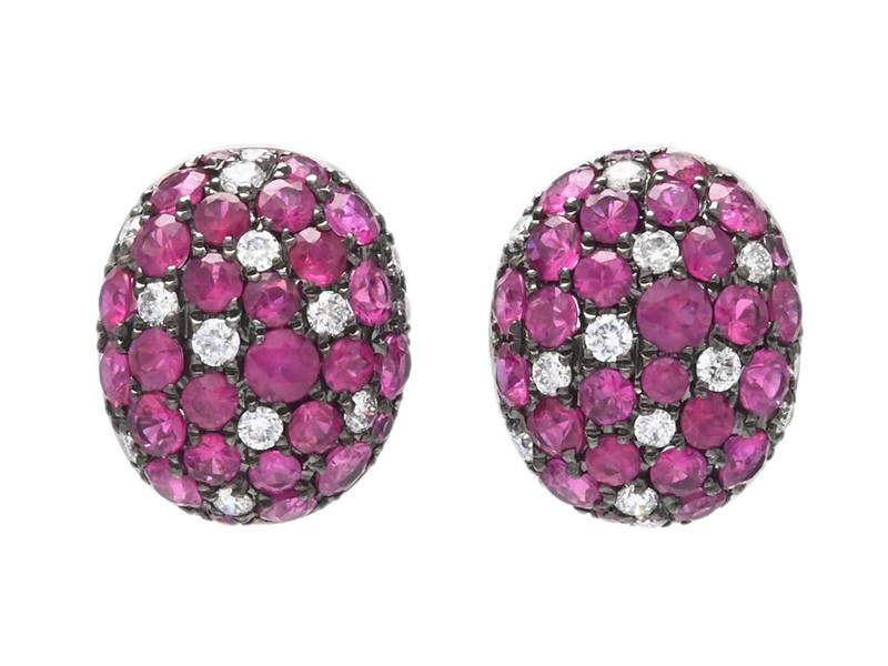 EARRINGS, 18K white gold, partly black rhodium plated, rubies approx. 2,41 ctw, 24 brilliant cut diamonds approx. 0,34 ctw, approx. W/SI, height 12 mm, weight 4,1 g, pushback.