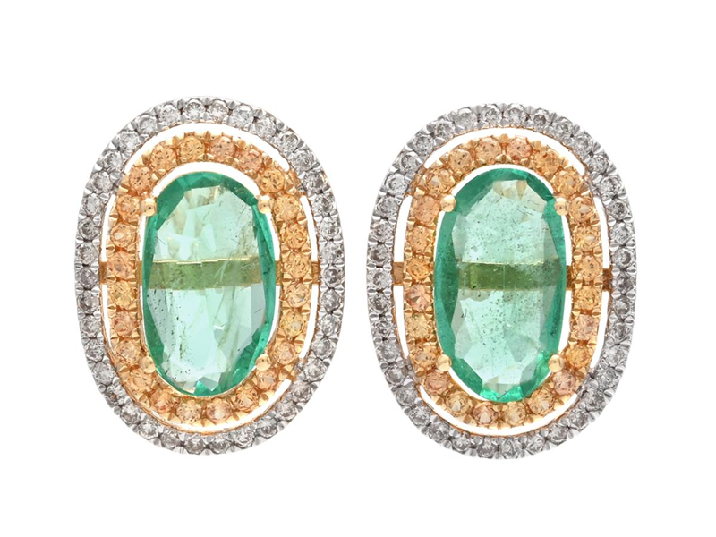 EARRINGS, 18K gold, partly rhodium plated, 2 oval cut emeralds approx. 2,11 ctw, yellow sapphires approx. 0,50 ctw, brilliant cut diamonds approx. 0,43 ctw, height 16,7 mm, weight 4,3 g, pushback.