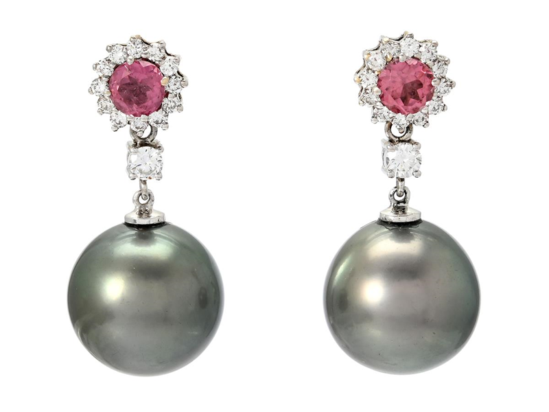 PEARL EARRINGS, 18K white gold, Tahitian pearls, approx. 14 mm, pink tourmalines, 26 brilliant cut diamonds approx. 0,70 ctw, approx. TW-W/VS-SI, height 30 mm, weight 12,5 g, pushback.