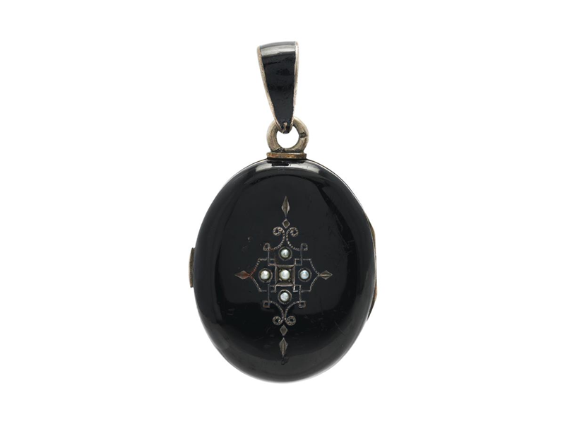 LOCKET, silver, black enamel, half pearls, openable, antique, height 53 mm, weight 19,1 g, damages on the enamel.
