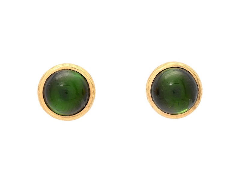 OLE LYNGGAARD, earrings, Lotus Stud Earrings, 18K gold, cabochon cut green tourmalines, design Charlotte Lynggaard, Denmark, diameter 7 mm, pushback, weight 2,0 g, missing backings.