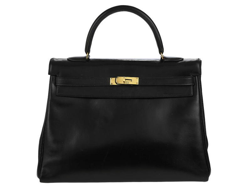 HERMÈS, BAG, Kelly 35 Box, black calfskin, gold harware, 35x24x13 cm, marked Z, year 1970, care booklet, receipt from spa for fixed handle, missing one stud, heavy signs of wear. Fair Condition.