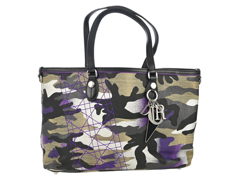 DIOR, BAG, Anselm Reyle Camouflage Medium Tote, Limited Edition, green, purple fabric, black leather, silver-tone hardware, 34x23x14 cm. Good Condition.