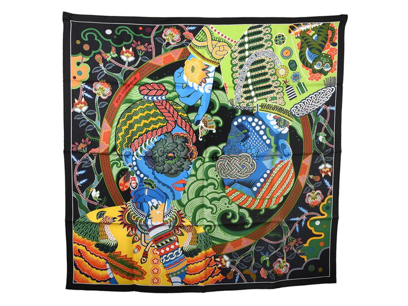 HERMÈS, SCARF, Duo Cosmique, Kohei Kyomori, 100% silk, 88x90 cm, multi-coloured, black, green, blue, original box. Excellent Condition.