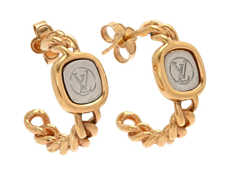 LOUIS VUITTON, EARRINGS, gold-tone metal, Logo LV, pushback, weight 7 g, marked M61093, Made in Italy. Very Good Condition.