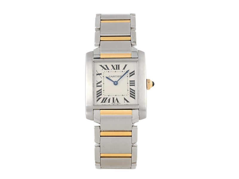 CARTIER, Tank Francaise, Cal 157, Ref no. W51006Q4, Case no. 2301/115875CD, midsize, 25 x 22 (30) mm, steel/gold, quartz, sapphire crystal, integrated original bracelet, folding clasp, overhauled June 2025, approx. 2000, box, paper box (damaged).