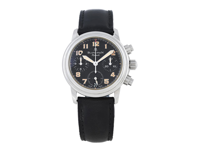 BLANCPAIN, Leman, Flyback, "Tritium Dial", Cal F185, Ref no. 2385F 1130, Serial no. 35, chronograph (Flyback), unisex, 33 mm, steel, self winding, sapphire crystal, date, leather strap, original steel buckle, approx. 1996.