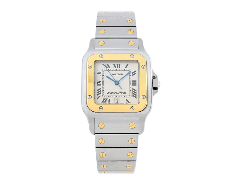 CARTIER, Santos Galbée, "Alpine", Cal 87, Ref no. W20011C4, Case no. 187901/24645, men´s wristwatch, 29 x 29 (41) mm, steel/gold, quartz, sapphire crystal, date, original bracelet, folding clasp, Ref no. C1159832, approx. 1990.