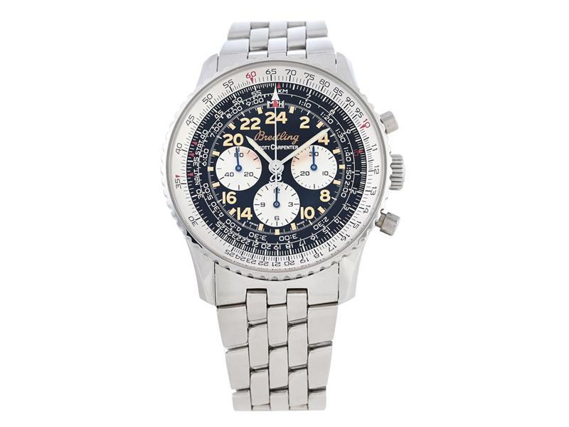 BREITLING, Cosmonaute (T Swiss Made T), "Scott Carpenter Mercury 7", Cal 12 (Lemania), Movement no. 4502567, Serial no. 10 0119/1000, Ref no. A12022, chronograph, men´s wristwatch, 41,5 mm, steel, manual winding, sapphire crystal, 24-hour indicator, rotatable slide roule, Navitimer bracelet, folding clasp, Ref no. I2096/302A, approx. 1996. Limited and numbered (No. 0119/1000).