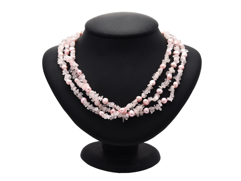NECKLACE, 3-rows, dyed cultured freshwater pearls, rose quartz, clasp in sterling silver, length 45cm, weight 54,6 g.