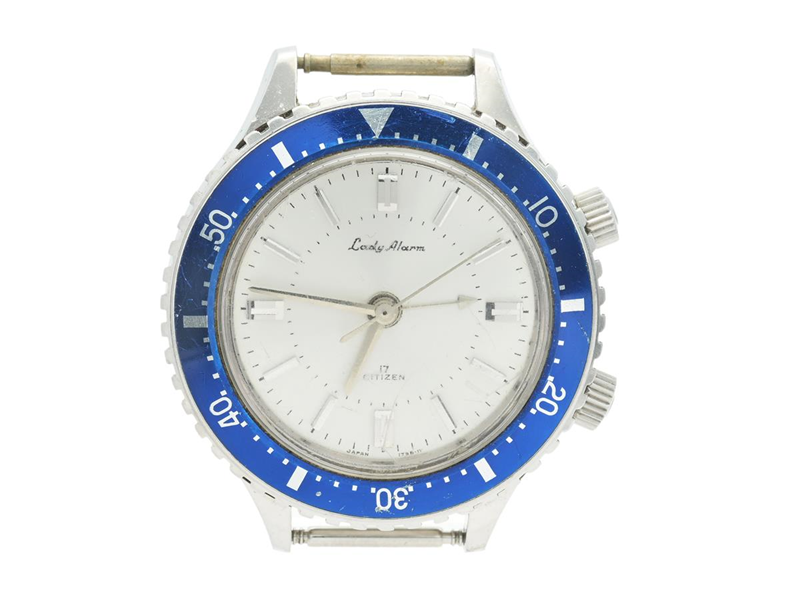 CITIZEN, Lady Alarm, ladies´ wristwatch, 35,5 mm, Case no. 80604413, white metal, manual winding, plastic crystal (damaged), alarm (defect), approx. 1970.