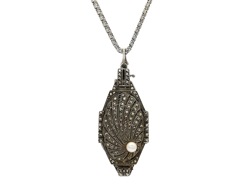 LORGNETTE, silver, marcasites, cultured pearl, weight 49,3 g, missing some stones and a few marcasites with damages.