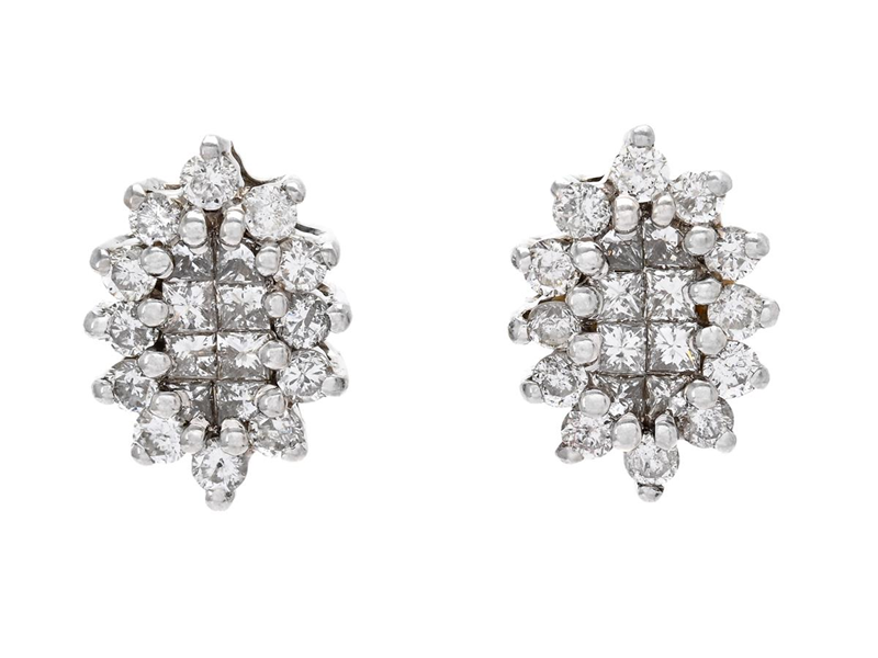 EARRINGS, 18K white gold, 40 brilliant- and princess cut diamonds 1,00 ctw according to engraving, approx. TW-Cr/P, 12x8,5 mm, weight 3,5 g, pushback, some diamonds with notches, weak settings.