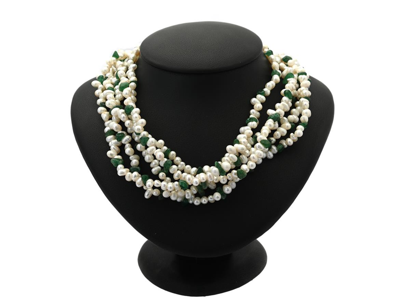 PEARL NECKLACE, cultured freshwater pearls, aventurine quartz, four rows, clasp in white metal, length 45 cm.