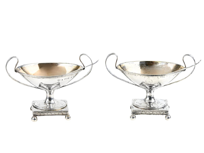 SALT CELLARS, one pair, silver, Nils Tornberg, Empire, Linköping 1814, Height 7 cm, weight 166,9 g, spoons enclosed, spoons with monogram engraving.