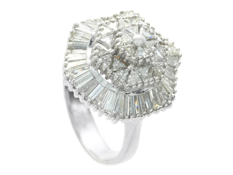 ENGELBERT, ring, 18K white gold, trilliant- and taper cut diamonds 1,90 ctw according to engraving, approx. TW-W/VS, size 16,5 mm, weight 6,8 g.