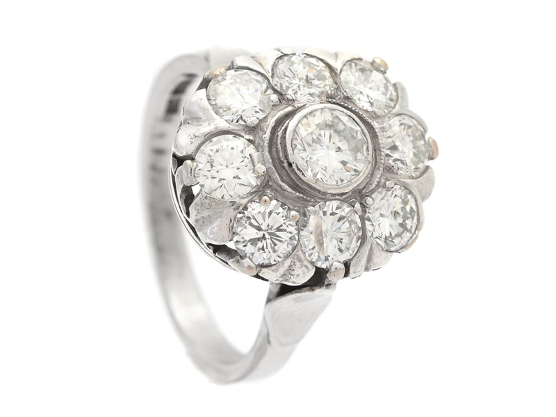 CLUSTER RING, 18K white gold, 9 brilliant cut diamonds 2,08 ct, approx. TW-W/P1, Stockholm 1966, size 17 mm, weight 5 g, center stone with damage on the crown and inclusion that reach the surface.