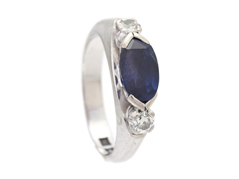 RING, 18K white gold, marquise cut sapphire, old brilliant cut diamonds approx. 0,20 ctw, approx. W-Cr/VS-P, Stockholm 1974, size 17 mm, weight 6,5 g, sapphire with notches.