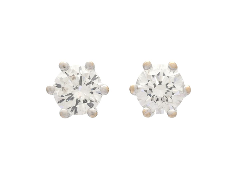 SOLITAIRE EARRINGS, 18K white gold, brilliant cut diamonds approx. 1,00 ctw, approx. W(H)/SI2-P1, pushback, weight 1,4 g, one diamond with inclusion that reach the surface, one the diamond with some thicker girdle and the second with thin girdle, one the diamond with notch at the culet.