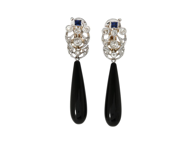 EARRINGS, 18K white gold, onyx drops 25,16 ctw, synthetic sapphires, antique-, old-- and rose cut diamonds approx. 0,90 ctw, France, height 50 mm, weight 13,0 g, pushback with clips, the sapphires and some diamonds has notch and damages.