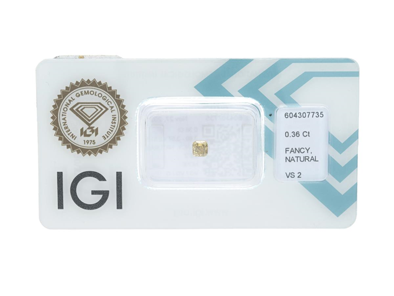 DIAMOND, cushion cut, 0,36 ct, Fancy Deep Greenish Brownish Yellow/VS2, IGI report 604307735, sealed.