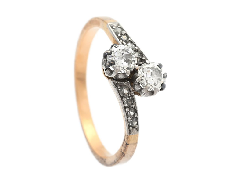 TWO STONE CROSS OVER RING, 18K gold, 2 old european cut diamonds approx. 0,40 ctw, single cut diamonds approx. 0,06 ctw, size 17,25 mm, weight 2,7 g.