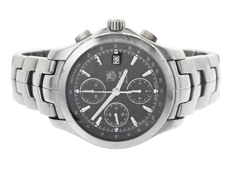 TAG HEUER, Link, (200 METERS), "Tachymetre", Cal 16 (ETA 7750), Serial no. LB2764, Ref no. CJF2110.BA0576, chronograph, men´s wristwatch, 42 mm, steel, self winding, sapphire crystal, date, integrated original bracelet, folding clasp, Ref no. FAA012-Y-R3/3091 Y, approx. 2004, box (skadad), paper box.