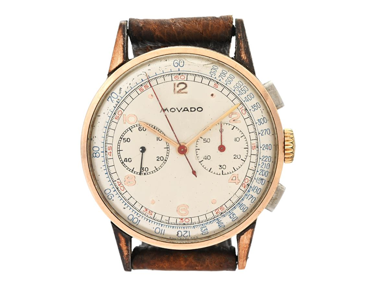 MOVADO, chronograph, men´s wristwatch, 34 mm, Cal 90, Ref no. 19031, Case no. A97646, pink gold on steel, manual winding, plastic crystal (damaged), damaged dial, defect (not working, needs overhaul, see detailed info), engraving, leather strap, approx. 1945.
