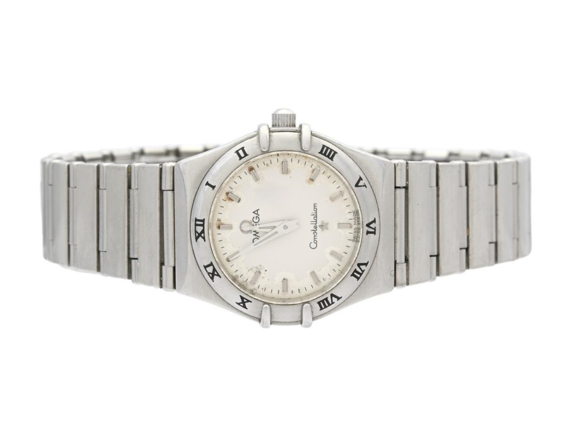OMEGA, Constellation, ´95, Cal 1456, Serial no. 59313000, PIC no. 1572.30.00, Ref no. ST 795.1201, Case no. 795.1201, ladies´ wristwatch, 25,5 mm, steel, quartz, sapphire crystal, damaged dial, defect (not working, rust, see movement picture) integrated original bracelet, folding clasp, Ref no. 6552/864, approx. 2000, service case.