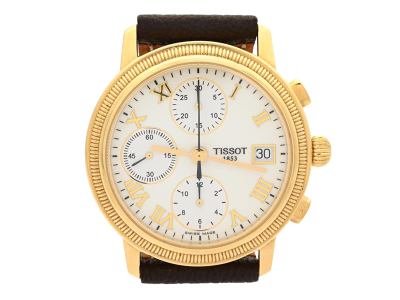 TISSOT, Bridgeport, Cal ETA 7750, Ref no. T71.3.465.13, Case no. G669.330, chronograph, men´s wristwatch, 38 mm, 18K gold, self winding, sapphire crystal, date, display caseback, leather strap, approx. 2015, box.