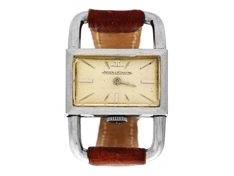 JAEGER-LE COULTRE, s.c. "Lucchetto", ladies´ wristwatch, 23 x 15 (36) mm, Cal K840, Serial no. 1992543, Case no. 1189474 / 1671, steel, manual winding, sapphire crystal (skadat), damaged dial, barrel shaped movement, leather strap, approx. 1968.