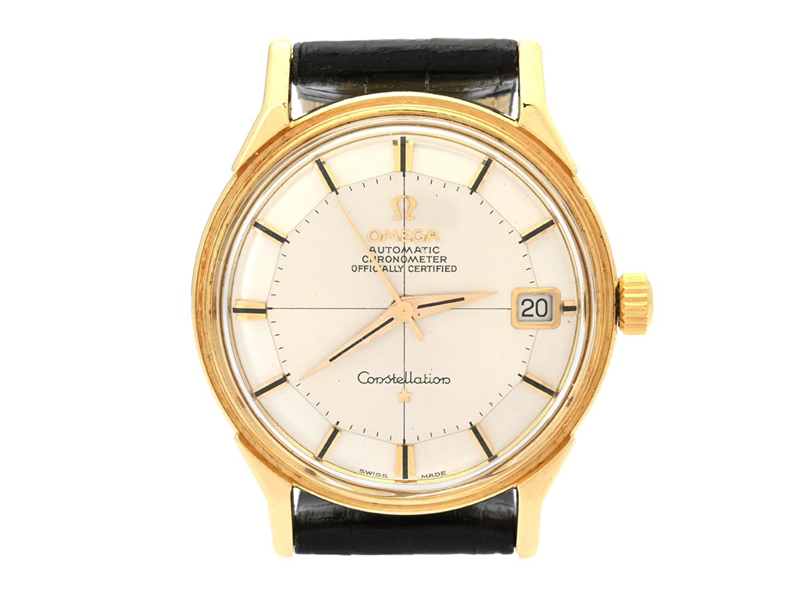OMEGA, Constellation, Calendar, Chronometer, s.c. "Pie-Pan", Cal 561, Serial no. 20940748, Ref no. BA 168.005, Case no. 168005/6, men´s wristwatch, 34,2 mm, 18K gold, self winding, plastic crystal, date, engraving, leather strap, approx. 1963.