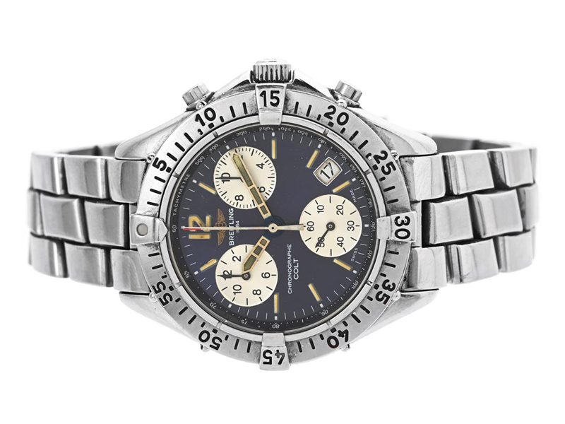 BREITLING, Chrono Colt, "Tachymetre", Cal 53, Serial no. 6364, Ref no. A53035, chronograph, men´s wristwatch, 38 mm, steel, quartz, mineral crystal, date, damaged dial, Professional bracelet (later), folding clasp, Ref no. S2703/823A, approx. 1994.