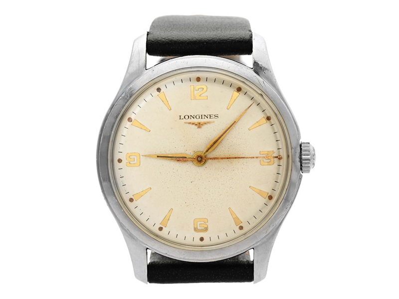 LONGINES, men´s wristwatch, 35 mm, Cal 12.68ZS, Serial no. 10347893, Case no. 6264 19/584 steel, manual winding, plastic crystal, damaged dial, leather strap, approx. 1956.