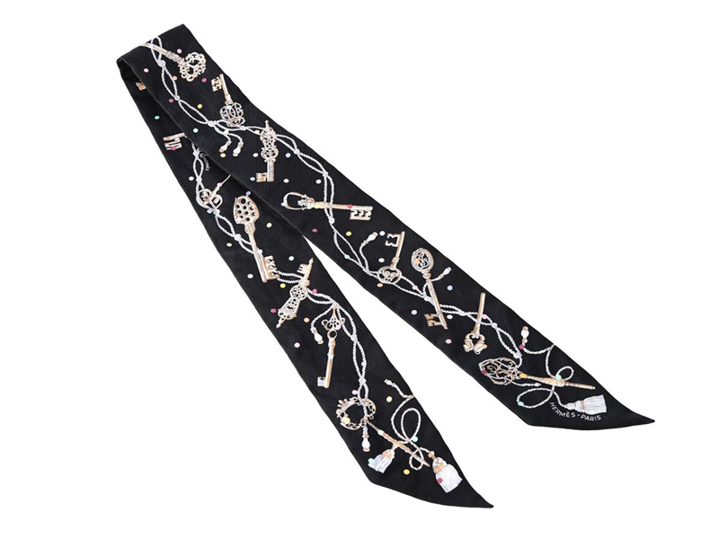 SCARF, HERMÈS, Twilly, 100% silk, 84x5 cm, black, white, gold, motif keys, case.