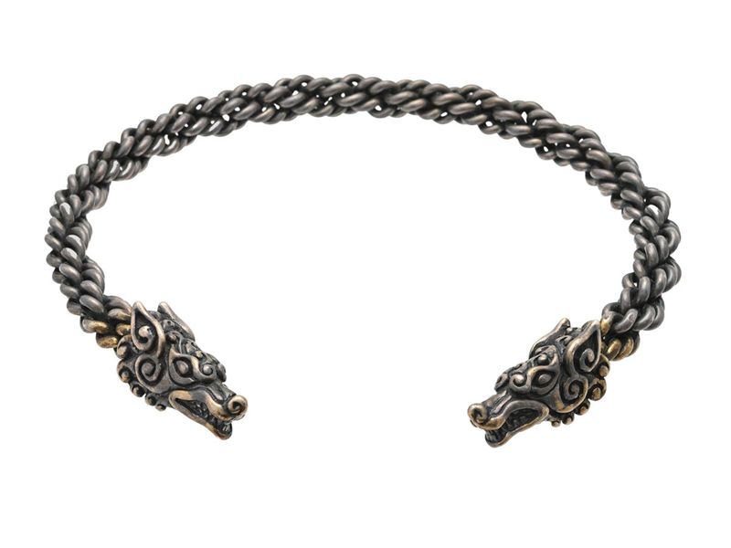 NECK RING, silver, stiff twined neck ring, wolf heads, adjustable in size, weight 193 g.