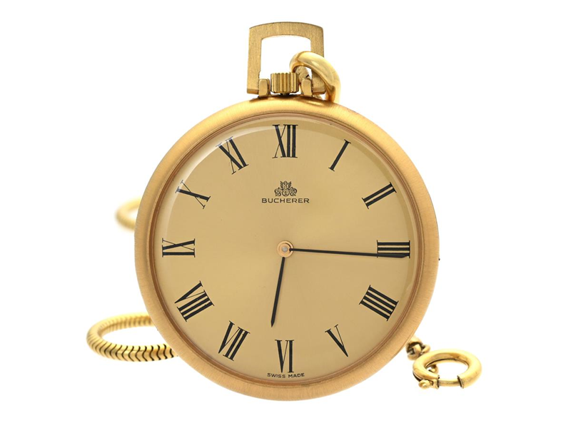 BUCHERER, dress watch, 42 mm, Cal Peseux 7040, Case no. 10.287, gold plated (10 micron), lever escapement, defect (not working), approx. 1960, pocket watch chain in yellow metal, case.