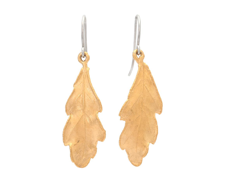EARRINGS, gold-plated oak leaves, Bluealg design, hooks in sterling silver, length 47,0 mm, weight 3,0 g.