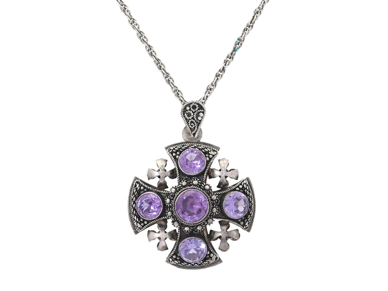 PENDANT WITH CHAIN, silver, synthetic sapphires, Jerusalem cross,, damaged, length 73 cm, vikt: 50,2 g.