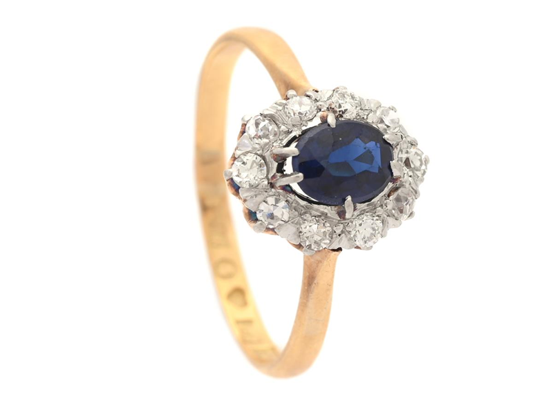 CLUSTER RING, 18K gold, synthetic sapphire, 10 single-, old-- and brilliant cut diamonds approx. 0,20 ctw, approx. TW-W/VS-SI, Stockholm 1933, size 18,5+ mm, weight 2,9 g, a few notches and indented naturals.